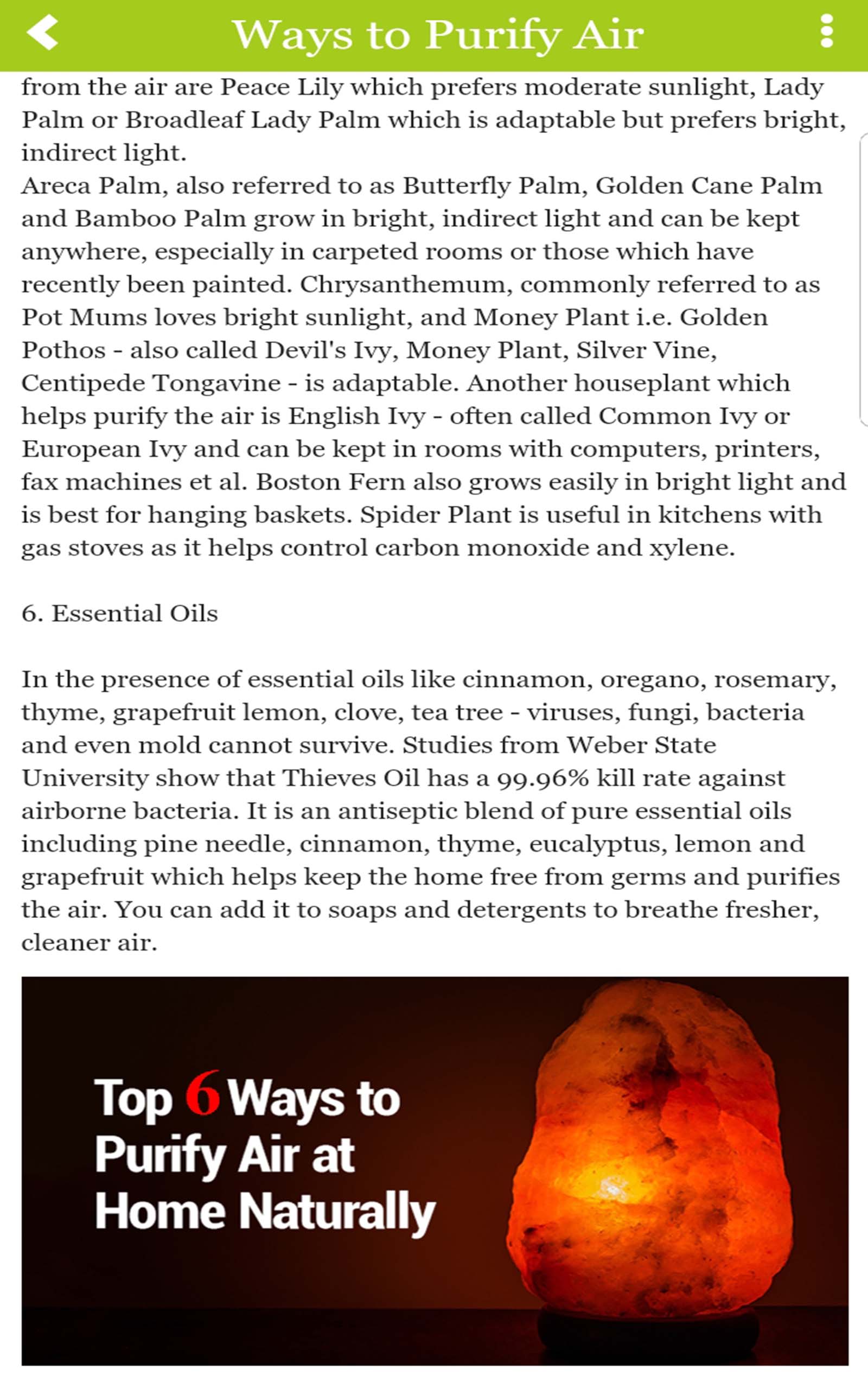 We tend to keep our windows tightly shut in the winter, but flinging open a window is not the answer, says. The vinegar neutralizes the odours naturally. Plants also produce oxygen, helping to make the air in your home fresher. Don't let the price discourage you. Give your lungs a boost and remove formaldehyde and other pollutants from your air. Plants can neutralize odors while releasing fresh, natural scents. Purify the air inside your house salt lamps: Though english ivy is commonly grown outside, it grows very well in pots indoors and is effective in removing formaldehyde. Activated charcoal use activated charcoal as a natural air purifier. If they are common paraffin candles, then they're made from petroleum and release chemicals such as benzene and soot in the air. Bamboo charcoal is another way of purifying air naturally. Here are 4 ways to naturally purify your home that you can begin immediately: Even in the winter, opening up your windows for a mere ten minutes can really allow the air to circulate and get some fresh air into your house.